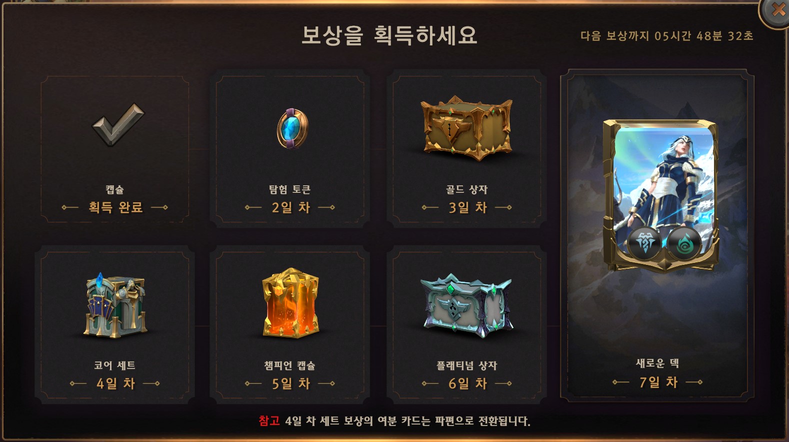 7일 차에 주는 애쉬를 포함하는 덱은 실제 내용물은 아직 모르겠지만 영웅을 준다는 점에서 입문자들에게 큰 도움이 될 것 같다.