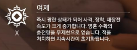 궁극기. 즉발형. 지속시간이 매우 길고 적을 처치하면 초기화해주기 때문에 해당 라운드의 대부분의 시간을 궁극기를 쓴 상태로 보낼 수 있을 것이라 보인다. 사용하면 사격, 장착, 재장전 등의 속도가 올라가며 기본 스킬의 능력을 향상 시켜준다(킬 즉시 자동 회복, 무시 스킬의 투명화 효과 등)