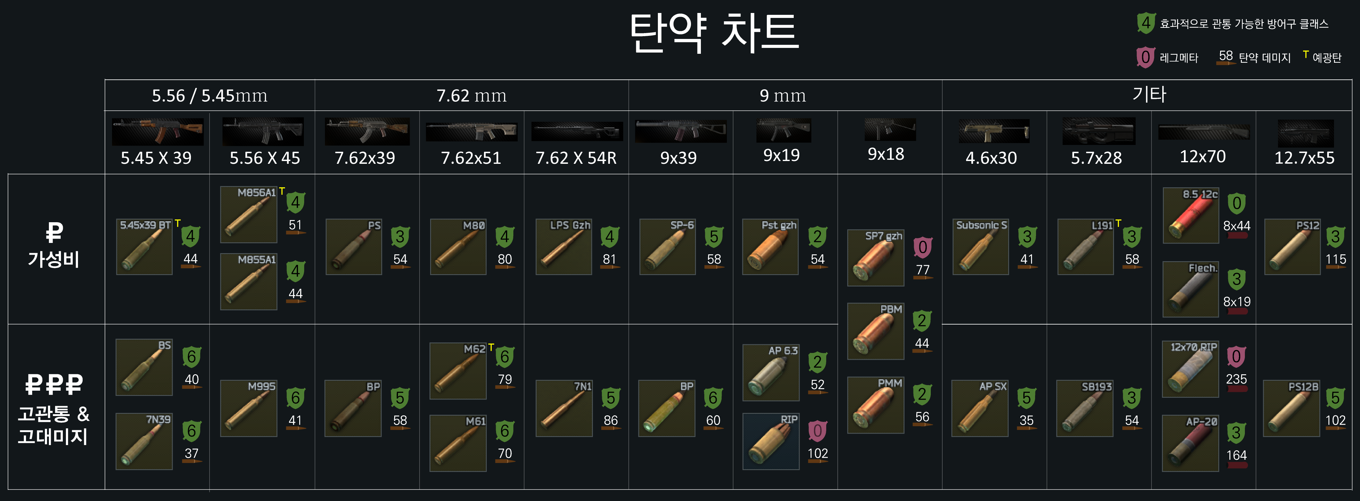 타르코프의 탄약 총 정리본, 원본은 타르코프 위키를 참고했다.